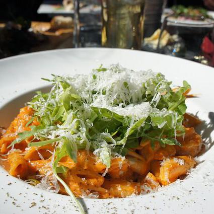 Du basilic, un pesto maison, quelques feuilles de salades, des oignons rouges, de la mozzarella et un steak 100% charolais de 200g. En accompagnement, frites de pommes de terre ou de carottes.